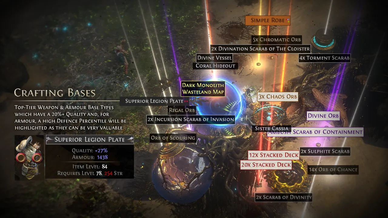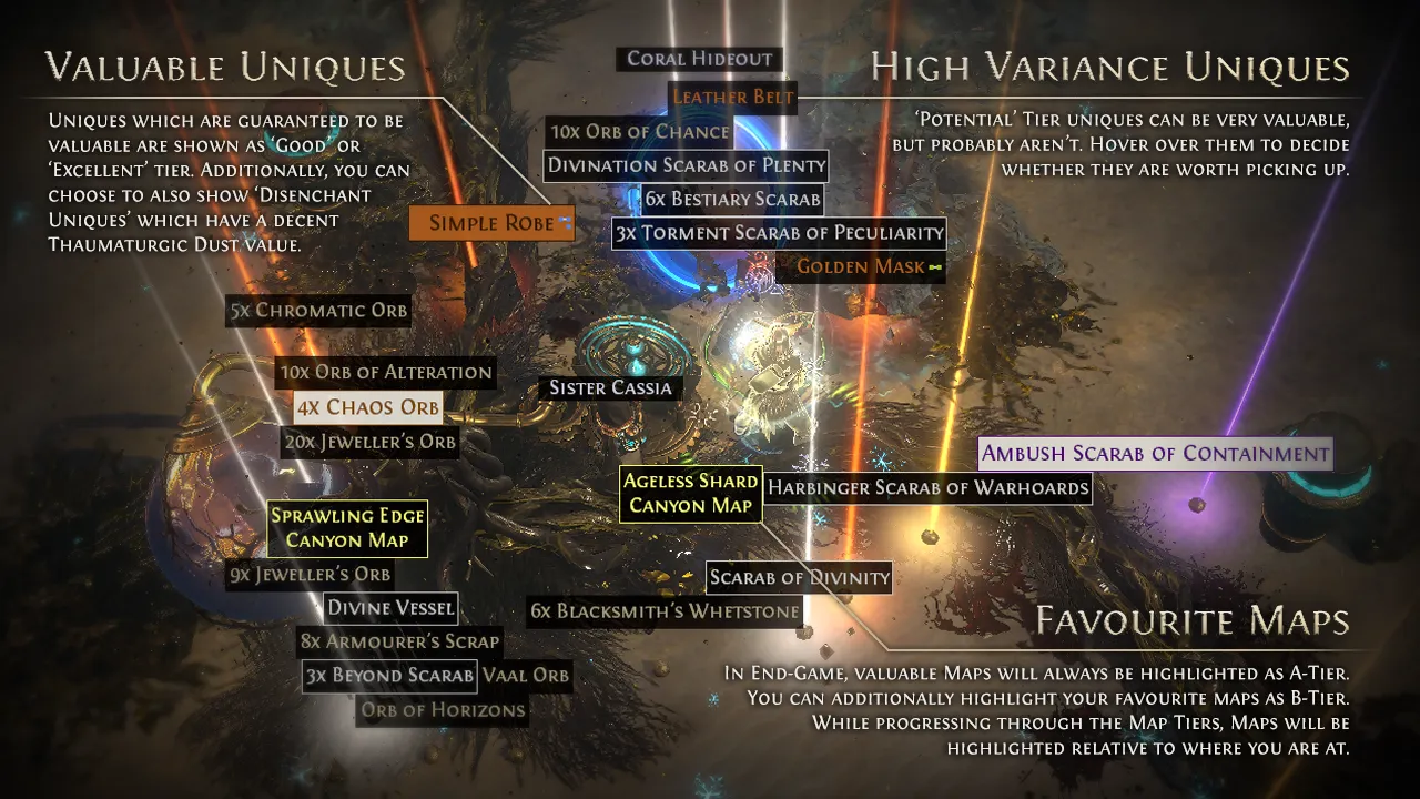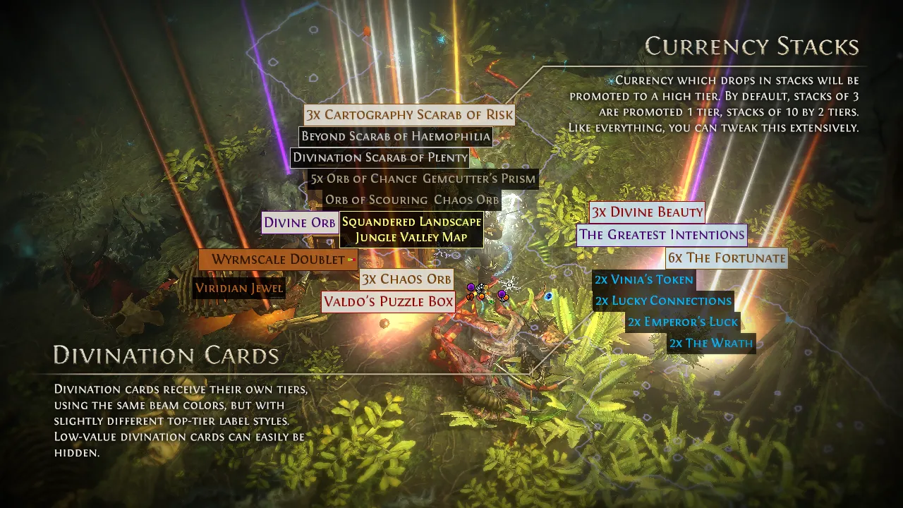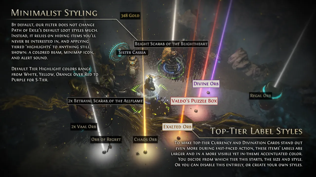 You don't have to learn what different colors or styles mean: the Drop Tier system is self-exaplanatory. Higher Drop Tier means more valuable. And we don't change the game's default label styles. A valuable white item will be a potentially interesting crafting base. A valuable yellow item will be a good identified rare. Maps, Scarabs, Divination Cards, Gems -- they all keep the game's default label styles so you can immediately identify them without needing to learn anything.
