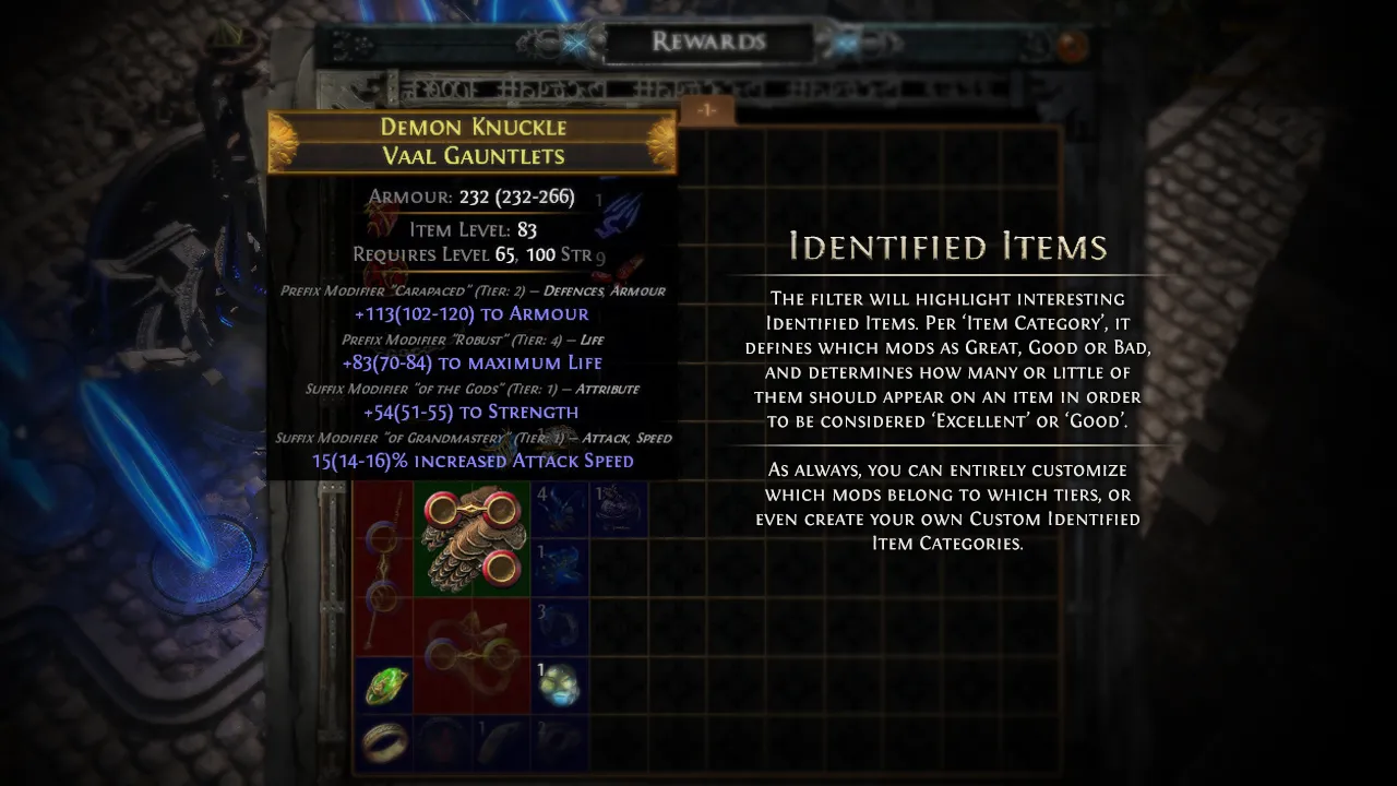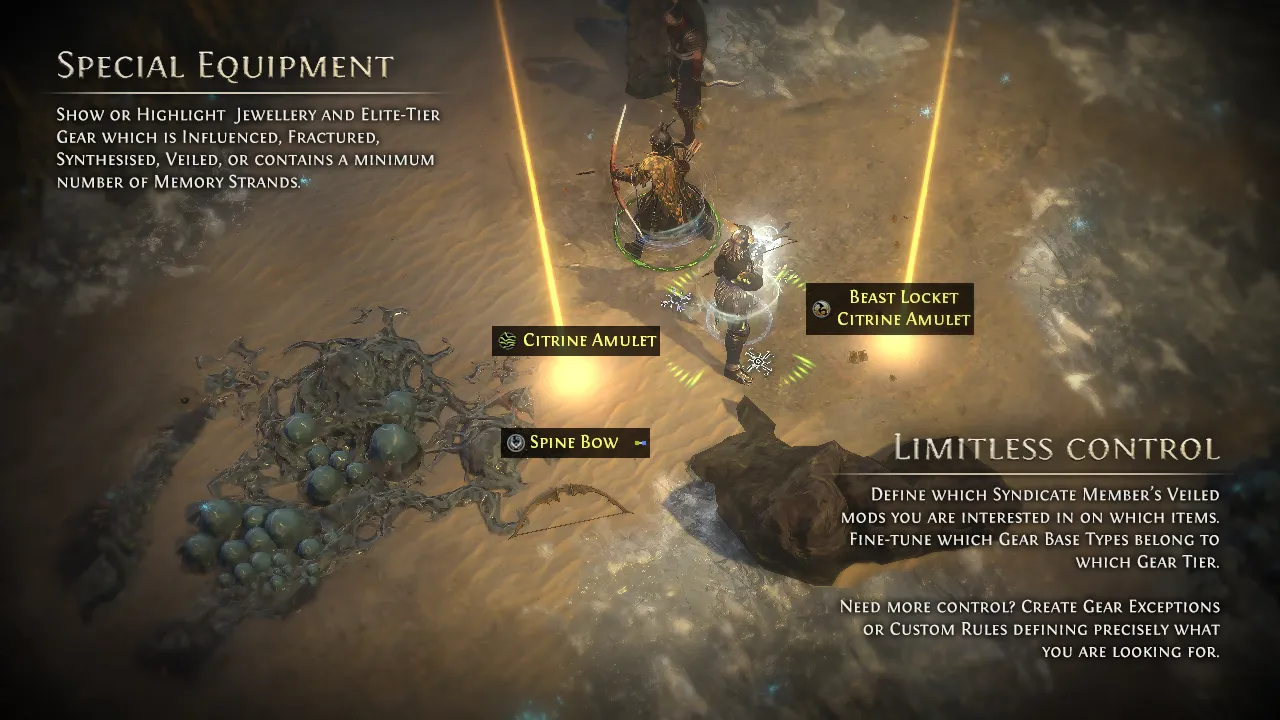 While leveling, you're only interested in weapons and armour that are useful for your build. During endgame, you're typically not interested in most items at all, except for 'special' gear like influenced, fractured or synthisised items. This filter hides the rest, always keeping a clean overview and adding to the game's beautiful atmosphere.